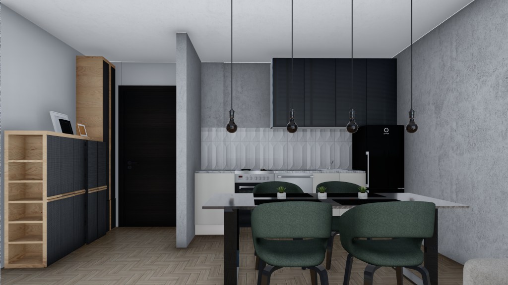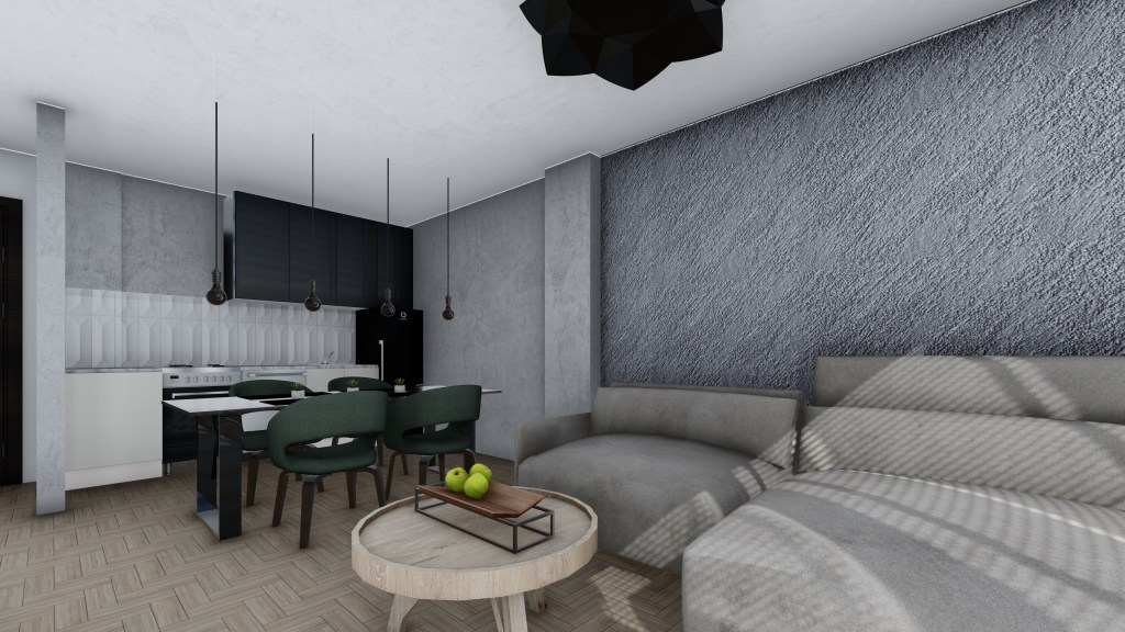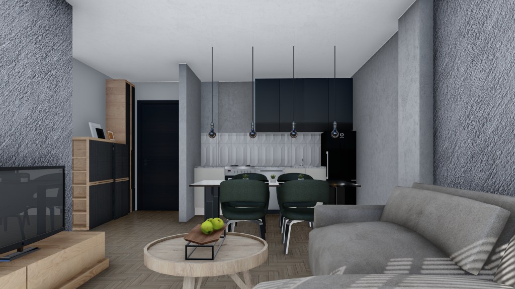 Kuhinja zauzima 3,38 m² i povezana je sa dnevnom sobom sa trpezarijom, čija površina iznosi čak 20,16 m², što čini centralni i najprostraiji deo stana. Ovaj otvoreni koncept omogućava dovoljno prirodnog svetla i prijatan ambijent za odmor, druženje i obroke.